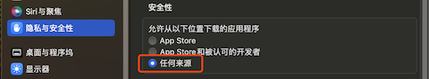 需要将设置中的「安全性与隐私」中的「允许从以下位置下载的应用」中开启「任何来源」,开启方法是在终端执行: