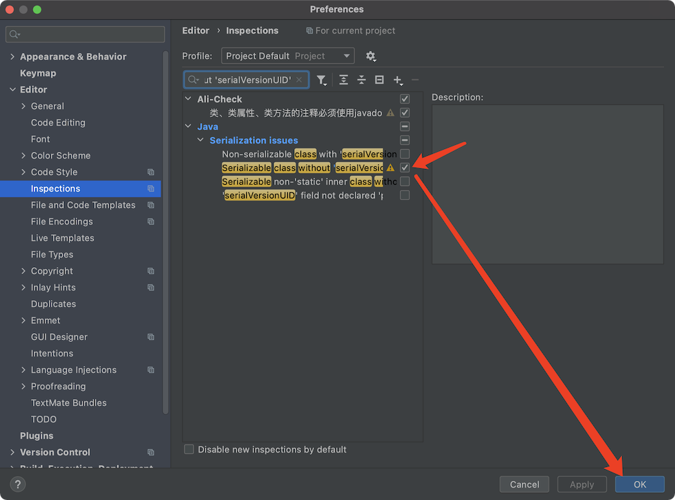 当一个类实现 Serializable 接口后,在 IDEA 里默认不会提示生成 serialVersionUID。